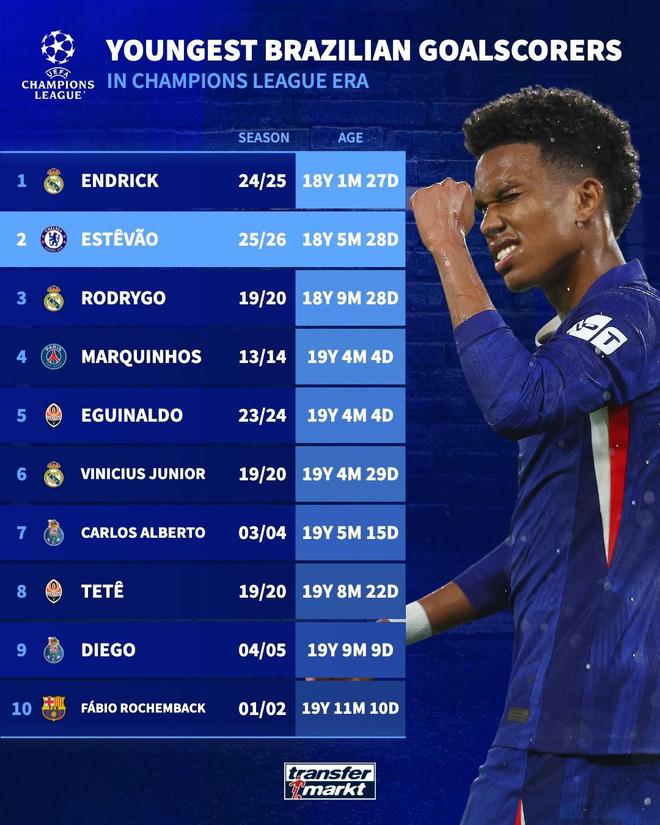 在对阵阿贾克斯的比赛中攻入首个欧冠进球后,18岁的埃斯特班成为切尔西队最年轻的欧冠进球者。他也是在欧冠联赛中进球的第二年轻的巴西球员,仅次于恩德里克。最年轻的巴西冠军进球球员 1. 恩德里克 24-25 赛季 18 年 1 个月 27 天 2. 埃斯特班 25-26 赛季 18 年 5 个月 28 天 3. 罗德里戈 19-20 赛季 18 年 9 个月 28 天 4. 马基尼奥斯 13-14 赛季 19 年 4 个月 4 天 5. 埃吉纳尔多23-24 赛季 19 年 4 个月 4 天 6. 维尼修斯 赛季 19-20 19 年 4 个月 29 天 7. 卡洛斯·阿尔贝托 03-04赛季19年5个月15天8.泰特19-20赛季19年8个月22天9.迭戈04-05赛季19年9个月9天10.法比奥·罗森巴赫01-02赛季19年11个月10【咪咕独家查看英超】