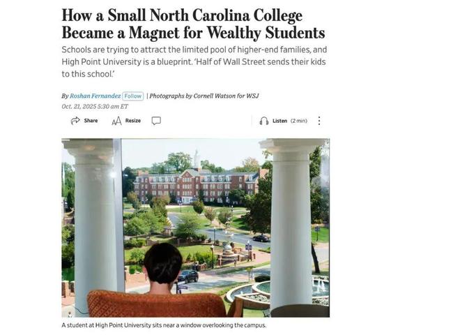 最近,《华尔街日报》的一篇报道严厉批评了北卡罗来纳州的一所地区私立大学。它不是传统意义上的名校。录取率接近70%。入场标准不高,但售价也不低。基本官方学费为 49,146 美元,食宿费为 20,198 美元。最新的年平均学费总额为78,458美元,相当于每年约60万元人民币。如果学习4年,轻松就能烧掉300万。这所大学是一所鲜为人知但昂贵的私立大学,实际上吸引了一半华尔街父母的孩子。您可能想知道为什么世界上最精明的华尔街父母会选择这样一所利润较低的大学。答案在于,大学正在玩精英再生产的游戏。消除了精英学校招生的微妙的传统结构,取代了其他学校的秘密运作自己明码标价,用奢侈品销售的逻辑公开推销教育服务。图片来源|华尔街日报 华尔街一半的孩子就读于这所学校。这所大学聚集了华尔街一半的精英,被称为海波因特大学(High Point University)。你从来没有听说过吗?它还是像雉鸡学校吗?但事实并非如此。我们成立于 1924 年,101 年来一直在北卡罗来纳州海波因特屹立不倒。虽然不如 Hayepsma 出名,但却是美国南部大学中的“第一名”,连续八年被《美国新闻与世界报道》评为最具创新力学校。我们也是北卡罗来纳州唯一一所在最佳管理、更好的宿舍、更好的就业服务和更活跃的学生会方面名列全国前十的学校。但这并不是它吸引华尔街家庭的真正原因。图片来源|华尔街日报官方网站海波因特大学的教授解释了其受欢迎背后的真相。总结起来有三点。首先,学校就像度假村,学生可以在这里享受生活并学习实用技能和知识。校园内遍布花园,随处可见喷泉(校长负责管理喷泉)。这里有六个室外温水游泳池,每个游泳池都配有按摩浴缸,还有一个耗资一亿美元的新图书馆。天文馆圆顶高 50 英尺,设有 100 多个斜躺座椅,可供天文学、解剖学和环境研究课程使用。最令人惊讶的是校园内名为“1924 PRIME”的高级牛排馆。我知道学生们每天晚上都可以盛装打扮并享用菲力牛排,但这并不是他们所做的全部。它也是学习社交礼仪和商业技能的实验室。在这里,学生们学习如何正确使用叉子、何时撒盐、如何互相打招呼、如何读懂别人的肢体语言,模拟真实的商务礼仪。广告中除了牛排馆外,还有地中海餐厅和铁板烧餐厅。学校希望学生在踏入校园之前熟悉先进的社会规则。学校还设有重建的华尔街交易室,配有股票价格和世界时钟。甚至还有一个模型飞机驾驶舱,供学生练习与管理层交谈或在偶然的机会中展示他们的商业计划。有时学校会邀请像苹果这样的人作为联合创始人。像创始人先生这样伟大的人沃兹尼亚克提供了实地指导。所有新生还必须参加为未来首席执行官举办的研讨会,内容涵盖从金融知识到目标设定的各个方面。由于科迪安大学秉持实用性和生活技能优先的理念,毕业生进入高等教育和就业的比率极高,因此您不必担心自己的职业道路。学校六年毕业率2023年毕业生就业率为75%,2024届毕业生中有99.2%计划在六个月内就业或攻读研究生,比全国平均水平高出14%。其次,把学生当作来学习、来消费的顾客。学生参观学校时,安排超大高尔夫球车游览。停车位上已经写满了学生的名字,细致程度堪比无数五星级酒店。超过一半的海波因特大学学生(2029 届毕业生的 56%)通过提前申请被录取。另一方面,正如头等舱乘客可以优先登机一样,他们还可以使用课程、大学宿舍和停车位。选择时会优先考虑提前入住。学校还提供校服福利。如果您穿着海波因特大学 T 恤,我们的礼宾部将为您提供前往机场的免费交通服务。否则,您将需要自掏腰包支付 95 美元。宿舍范围从基本别墅到500平方英尺的私人别墅,价格从25,000美元到近40,000美元不等。第三,校长必须成为销售大师,像经营企业一样经营学校。 20年前,库宾校长接管海波因特大学时,学校又老又穷,学生人数不足1700人。二十年后,校园从92英亩发展到560英亩,拥有128栋新建或翻新的教学楼、15个完整学院、73个本科专业、70个辅修和研究生课程,学生人数增加两倍,达到6300多人。库宾是如何做到的?成为一名推销员并吸引有钱人!他首先精准地瞄准了自己的客户源,只招收那些能够支付全额学费、没有折扣或折扣的富家子弟。随后,他向当地富有的朋友募捐,两年内筹集了近 6000 万美元。过去,学校每年的预算只有几百万日元。他像经营企业一样经营学校:购买土地并建造建筑,增加热门专业和课程,配备设施,他是一流的,用他的商业理念重建海波因特大学。迄今为止,校园投资已超过20亿美元,学校每年为当地经济贡献8.5亿美元。在富二代聚集的度假村留学是怎样的体验?当《华尔街日报》公开报道这所度假型学校后,几乎所有就读过该校的人都无法再否认它是一所针对二代学生的高档乡村俱乐部的事实。一些毕业生表示,该校在当地享有很高声誉,大部分同学都来自保守、富裕的南方家庭,尤其是富裕的基督教家庭。于是,大家给高店大学取了一个有趣的名字。 UCK(客户子女大学)是指我们的大学。然而,戏剧就是戏剧。这并不意味着高店大学只招富二代帅哥恩特。事实上,这里也有很多低收入、聪明、勤奋的孩子。他们取得好成绩并获得奖学金。这所学校到底有多吸引人呢?一名本来可以在2023年就读普林斯顿大学的20岁学生最终选择了就读这所学校。和其他大学一样,我们有水系和水课程,但