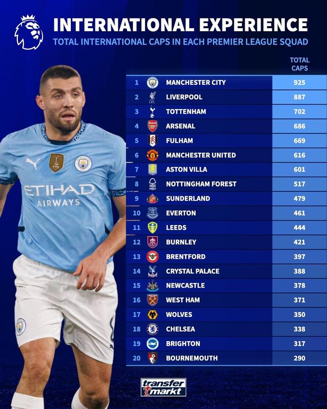 北京时间10月31日,主帅周德整理了本赛季至今20支英超俱乐部球员国家队出场次数排名。曼城以925场比赛排名第一,利物浦以887场比赛排名第二,托特纳姆热刺以702场比赛排名第三,相对年轻的切尔西以338场比赛排名第18位。根据德国转会统计,本赛季英超俱乐部国际出场次数:1.曼城925场2.利物浦887场3.托特纳姆热刺702场4.阿森纳686场5.富勒姆669场6.曼联616场7.阿斯顿维拉601场8.诺丁汉森林517场9.桑德兰479场10. 埃弗顿 461 场 11. 利兹联 444 场 12. 伯恩利 421 场 13. 布伦特福德 397 场 14. 水晶宫 388 场 15. 纽卡斯尔联 378 场 16. 西汉姆联 371 场 17. 狼队 350 场 18. 切尔西 338 场 19. 布莱顿 317 场20. 伯恩茅斯 290 场比赛本赛季为 20 支英超俱乐部出场次数最多的球员: 1. 桑德兰·扎卡(瑞士)141 场 2. 富勒姆·劳尔·希门尼斯(墨西哥)121 场 3. 埃弗顿·伊德里萨·瓜伊(塞内加尔)119 场 4. 曼城·科瓦契奇(克罗地亚)111 场 5. 利物浦·萨拉赫(埃及)106场 6.托特纳姆热刺 本·戴维斯(威尔士)100场 7.伯恩利 凯尔·沃克(英格兰)96场 8.诺丁汉森林 克里斯·伍德(澳大利亚)88场 9.布伦特福德·乔丹·亨德森(英格兰)86场 10.纽卡斯尔联 法比安·谢尔(瑞士)86场 11.西部汉姆联苏切克(捷克共和国)85场比赛12.曼联布鲁诺·胡埃尔南德斯(葡萄牙)84场比赛13.切尔西·斯特林(英格兰)82场比赛14.阿斯顿维拉·麦金(苏格兰)81场比赛15.水晶宫伊斯梅拉·萨尔(塞内加尔)74场比赛16.阿森纳赖斯(英格兰)73场比赛17.狼队 黄熙灿(韩国) 73 场比赛 18. 利兹联 比约尔(斯洛文尼亚) 67 场比赛 19. 伯恩茅斯 瑞恩·克里斯蒂(苏格兰) 62 场比赛 20. 布莱顿·米尔纳(英格兰)61场【英超联赛入场仅限米格机】