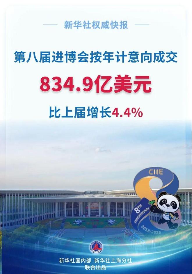 11月10日下午,第八届进博会在国家会展中心(上海)圆满闭幕。据新华社最新消息,第八届中国国际进口博览会一年预计销售额834.9亿美元,比上届增长4.4%,创历史新高。在10日下午举行的第八届进博会闭幕新闻发布会上,上海市政府副秘书长、市商务委主任、城市服务保障指导小组秘书长朱民宣布,上海贸易集团一年内预计成交额达106.2亿美元,比上年增长5.14%,位居地方企业集团之首。连续8年。其中,与共建“一带一路”国家的交易额有所增加与上年相比增长了34%。中国国际进口展览局党组书记、副局长、国家会展中心(上海)董事长吴正平表示,今年进博会组织了约5万名社会观众首次现场观展,深入体验进博会积极面,感受进博会魅力,有效提升了展会知名度,加强了展商与观众的交流。截至2025年11月10日中午,进博会目前观众总数92.2万人次,较上届增长8.2%,创历史新高。吴正平透露,进博会共组织了43个贸易团、700多个贸易分团,注册参观人数超过46万人次,比上年增长7%,创造了多种交流方式以及为参展商和会员店提供联系机会。新民晚报(xmwb1929)是新华社、报纸联合社编辑:魏嘉伟编辑:何迪